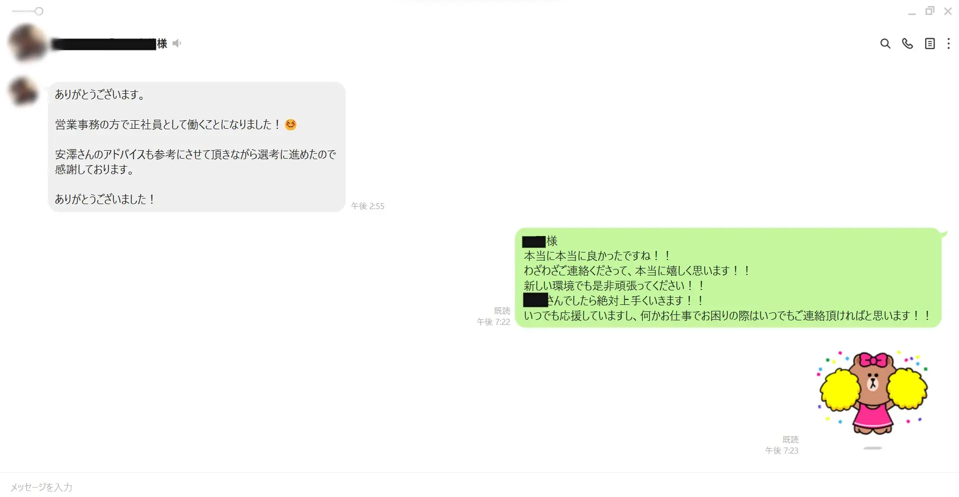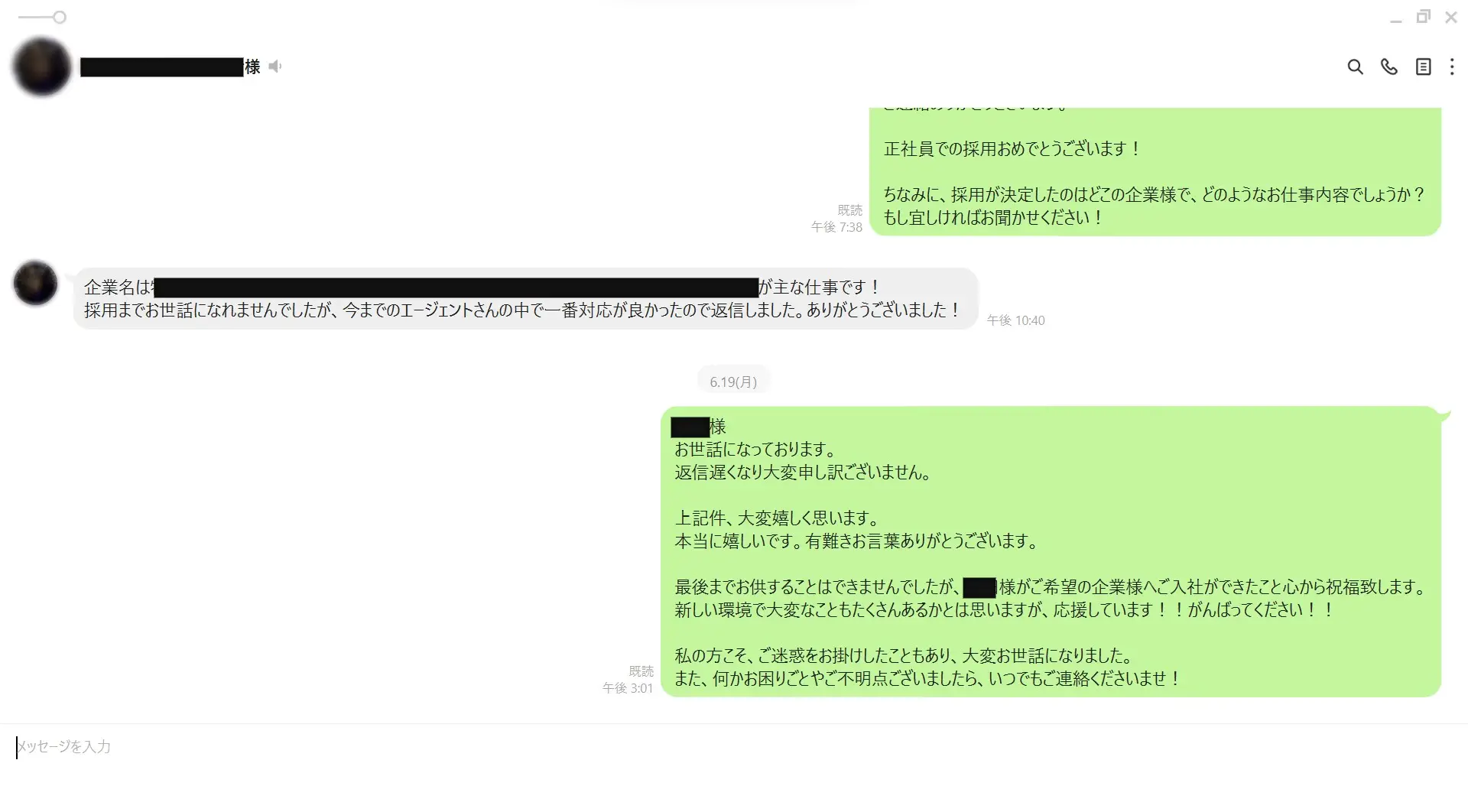 「いまどんな感じですか?」「転職活動進んでますか?」など定期的に連絡していて、ラリーが続いていました。
