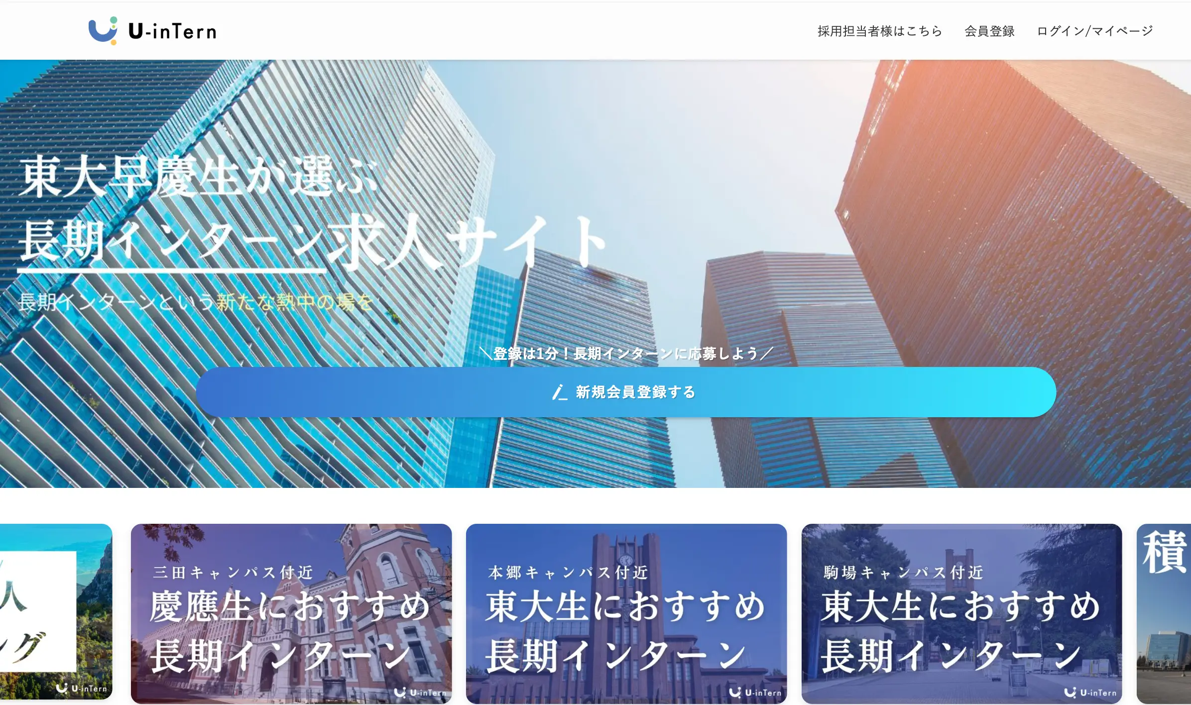 U-inTernは、東大・早慶生に人気の長期インターン求人サイト!登録者数は1000名以上の東大生を含み、MARCHや関東圏の大学生にも幅広く利用されています。優良企業のインターン情報を豊富に掲載し、成長意欲の高い学生に最適な機会を提供。業界研究やキャリア形成にも役立つU-inTernで、自分に合ったインターンを見つけよう!