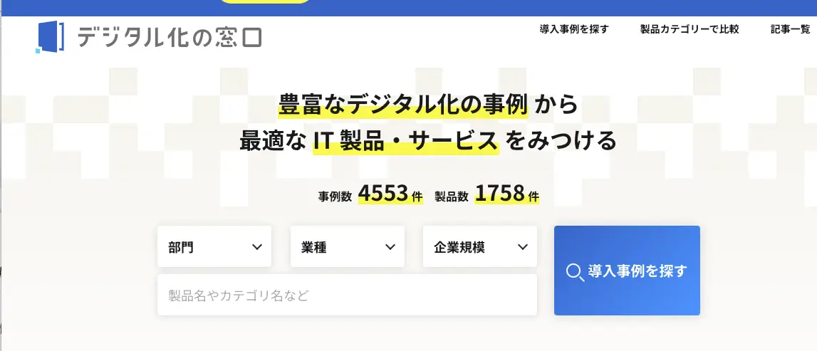 「デジタル化の窓口」は、企業に必要な IT サービスの導入事例と特徴を、分かりやすく整理して、解説することで、自社に最適な IT 製品・サービス を見つけるお手伝いをします。