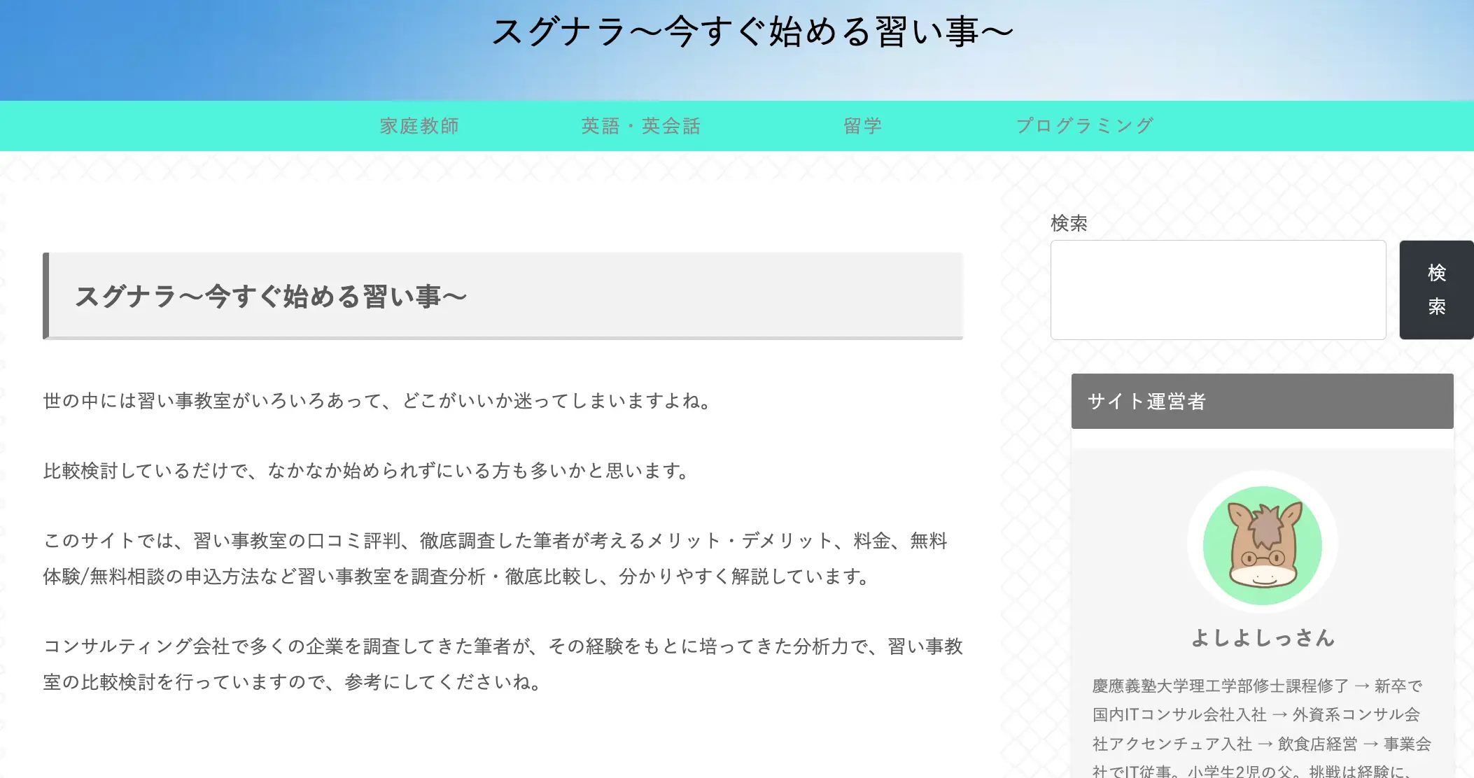 「スグナラ」では、習い事教室の口コミ評判、徹底調査した筆者が考えるメリット・デメリット、料金、無料体験/無料相談の申込方法など習い事教室を調査分析・徹底比較し、分かりやすく解説しています。