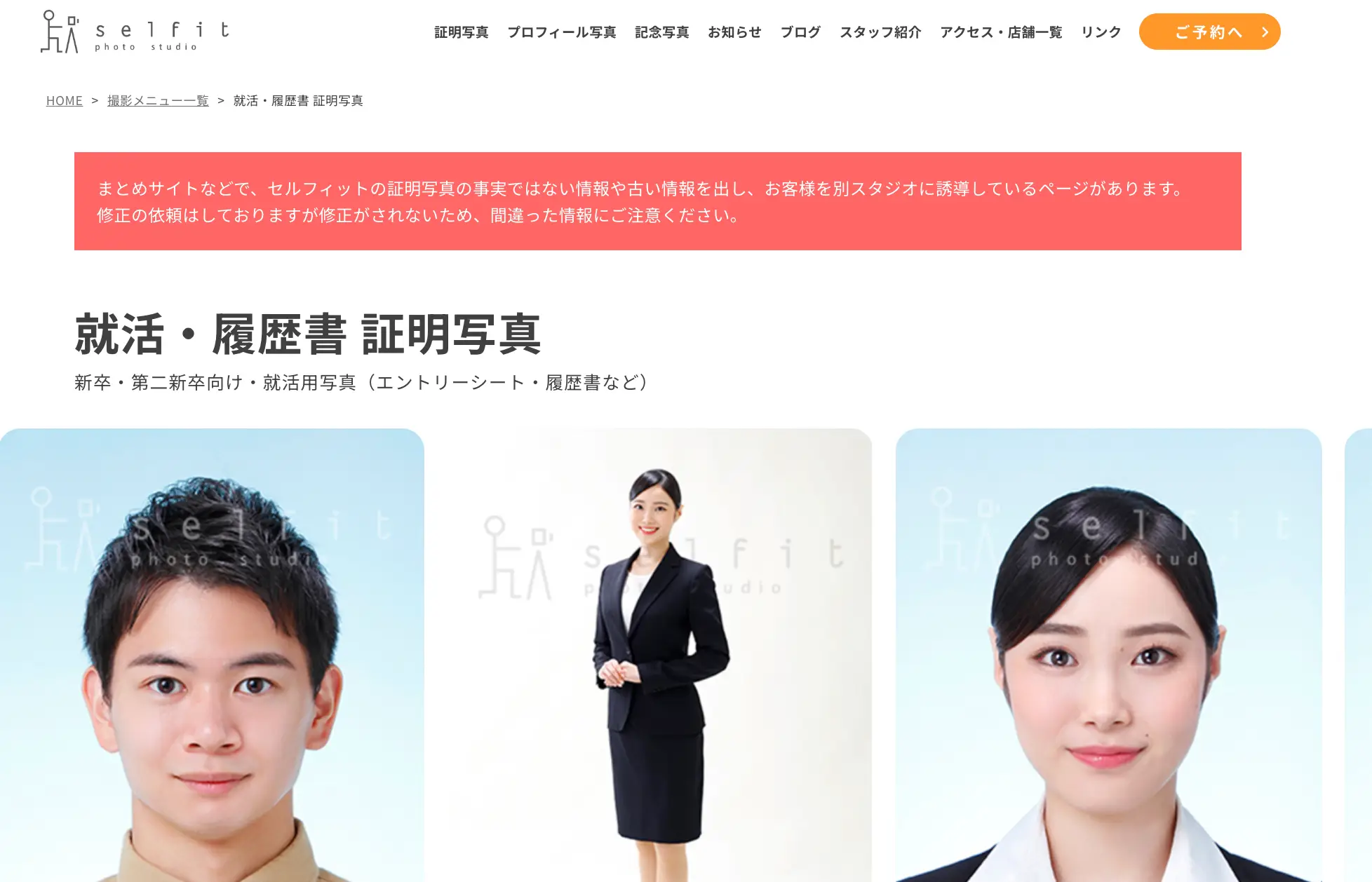 セルフィットは、新卒・第二新卒の就活用履歴書写真・インターンES用写真に特化したヘア&メイク付きプランのあるフォトスタジオ。大阪(梅田・あべの)、京都四条烏丸、名古屋栄、全店ターミナル駅近で便利!